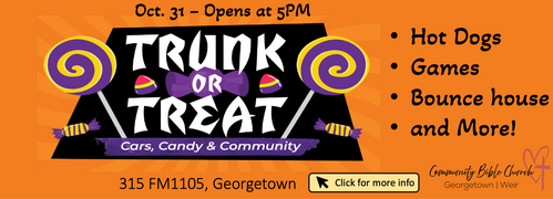 Bring the whole family for a fun, safe, and exciting Halloween night at Community Bible Church! We’ll have free food, a bouncy house, games, candy, and tons of decorated trunks to explore. Come dressed up, bring your friends, and enjoy a night full of laughter, connection, and community. This is a great chance to meet neighbors, make memories, and share the love of Jesus in a fun and welcoming way.