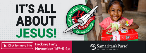 Each year we join together to share the love of Jesus through Operation Christmas Child. This ministry, led by Samaritan’s Purse, delivers shoebox gifts filled with toys, school supplies, and personal care items to children around the world. Every box is an opportunity to bring joy, hope, and the message of God’s love to a child in need.